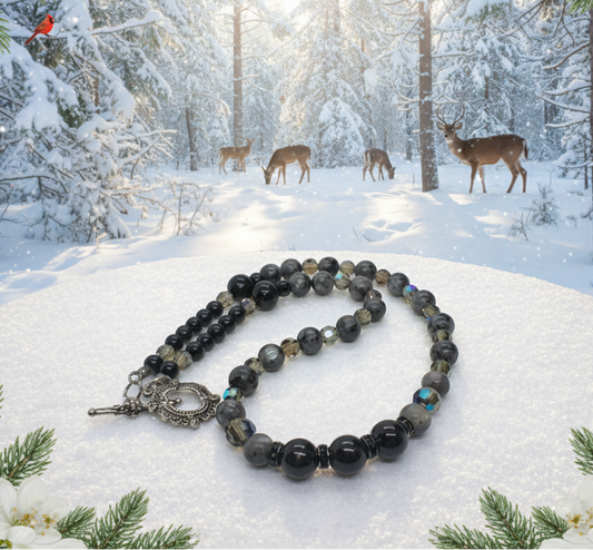 Fabulous Black & Gray Labrador, Black Onyx and Black Diamond Crystals, Semi-precious, Beaded Necklace B-handcrafted by Artistry Jewelry