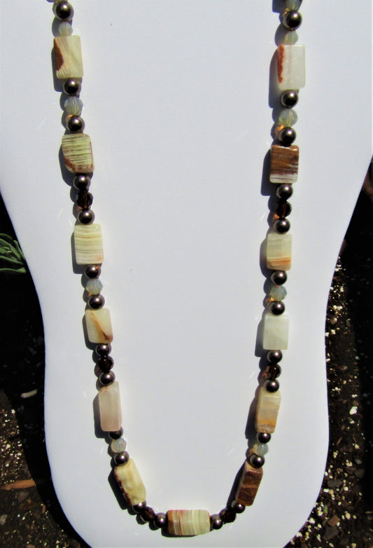 Lovely Natural Snow Quartz, Black Onyx, Howlite and Mountain Jade, Semi-precious, One-of-a -kind, Beaded Necklace A-crafted by Artistry Jewelry