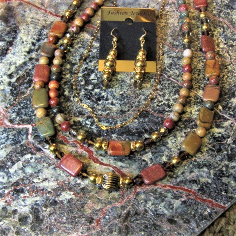 Perfect Natural Redline Marble, Sand Opal Crystals, and Druk pearl beads, Two-strands, Beaded Necklace Set-crafted by Artistry Jewelry