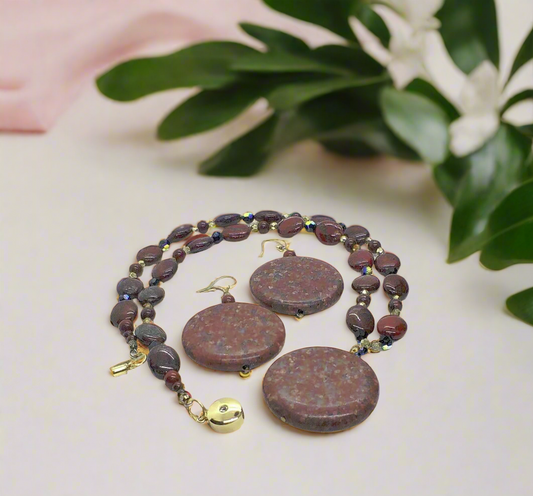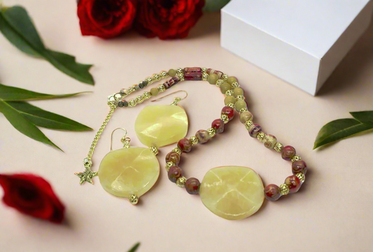 Perfect Natural Redline Marble, Sand Opal Crystals, and Druk pearl beads, Two-strands, Beaded Necklace Set-crafted by Artistry Jewelry