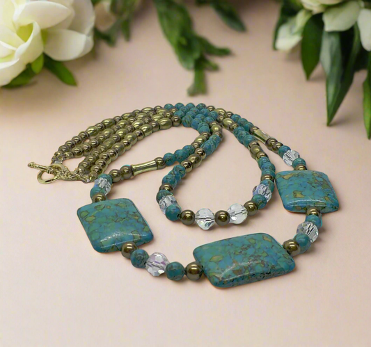 Lovely Blue Mosaic Turquoise, and Austrian Crystal, Two-strand, Forever Beaded Necklace-crafted by Artistry Jewelry