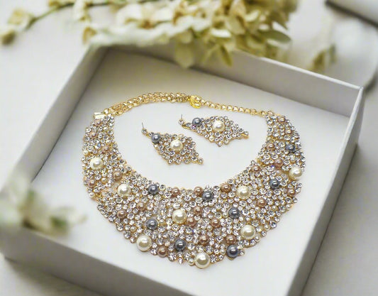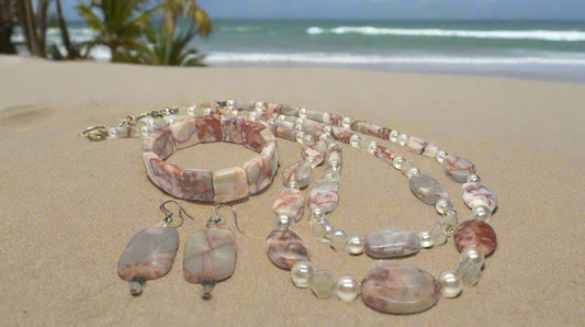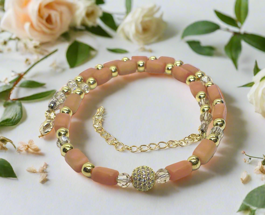 Exceptional Crystal and Buri, Peach, and Cream Beaded Necklace Set with Cubic Zirconia - handcrafted by Artistry Jewelry