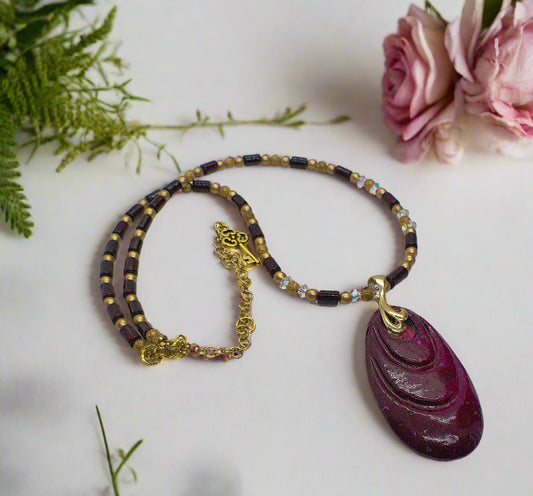 Enchanting Dark Burgundy, Fossil, Crystal, Chain, and Bead, One-of-a-Kind Necklace - handcrafted by Artistry Jewelry