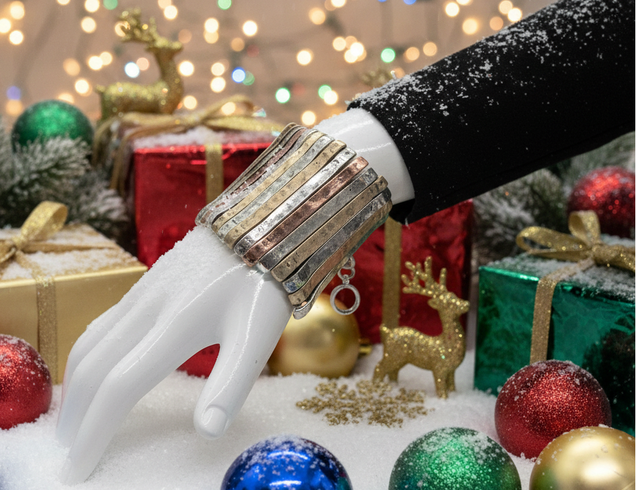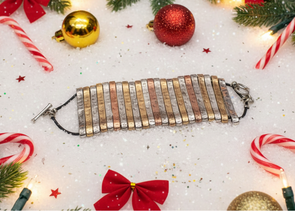 This stunning aged finished metal bracelet with a metal bar is the perfect piece of jewelry for that special occasion. You can even wear it with jeans to go hang out with friends. Versatile and gorgeous, you can't lose with this bracelet. It also makes the perfect gift for all those special people in your life. It also makes a perfect gift for yourself. Go ahead, you deserve it!! Comes in a gift box. Material: Three-tone hammered metals, faux rubber cord, toggle closure. Length: 7-1/2 inches long and 2-1/4 inches tall.