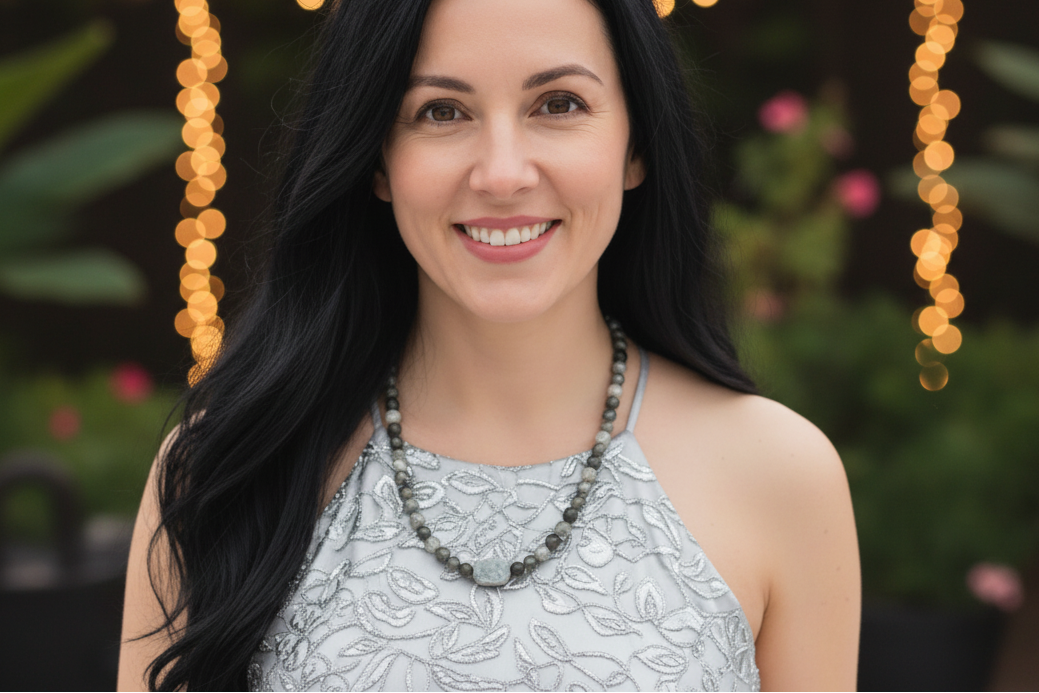 This exquisite necklace features the ethereal, shifting glow of Natural Labradorite—often called the stone of magic—seamlessly paired with the serene and timeless beauty of Mountain Jade. At the heart of this composition lies a striking Gray Marble rectangle focal, lending an architectural and modern edge that speaks to true originality. To catch the light with every turn, we have integrated fabulous Black Diamond crystal beads, adding a layer of sophisticated mystery and a radiant, subtle sparkle.