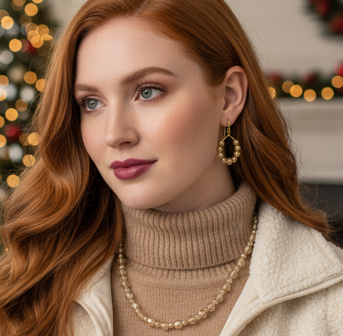 Beautiful Peach/Amber, Crystal and Cream, Golden Shadow Beaded Necklace Set handcrafted by Artistry Jewelry