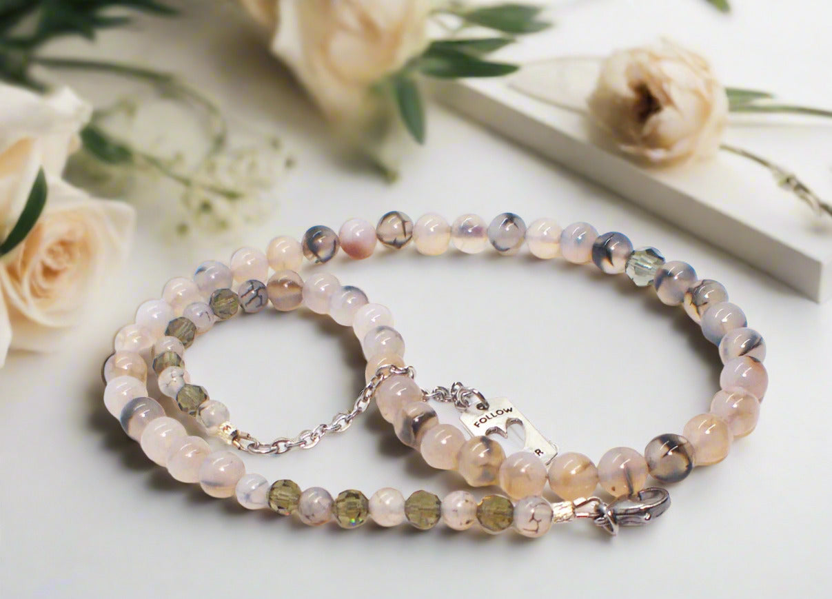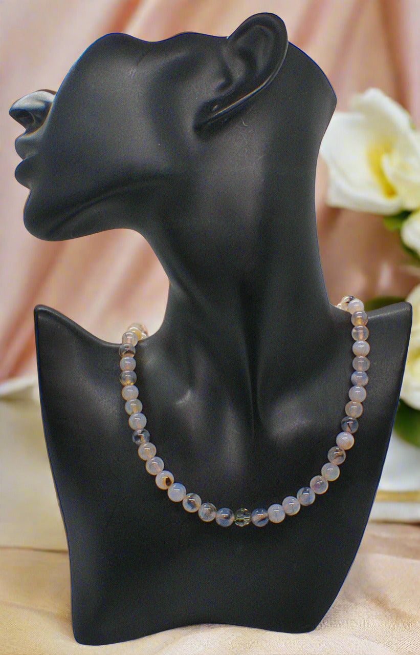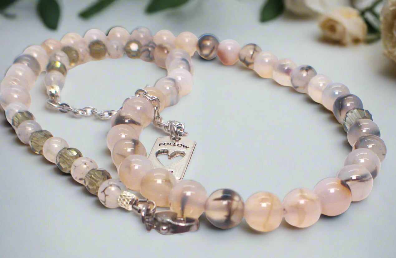 Captivating Black Dragon Vein Agate Necklace - This beautiful one-of-a-kind piece of jewelry is so perfect for those looking for originality. This piece was crafted with beautiful Dragon Vein Agate beads and Swarovski Black Diamond Crystal beads, which added the beautiful finishing touches. Fits beautifully around the neck to be worn with many items in your wardrobe. The perfect gift for that special person or yourself. Simply perfect. Remember it's a one-of-a-kind item. No one else will be wearing the same thing when you go out. It's all about you. Comes in a gift box. Necklace is approx. 19". Has a 2" extender chain with a charming "Follow Your Heart" charm. Colors: cream, black, brown, silver