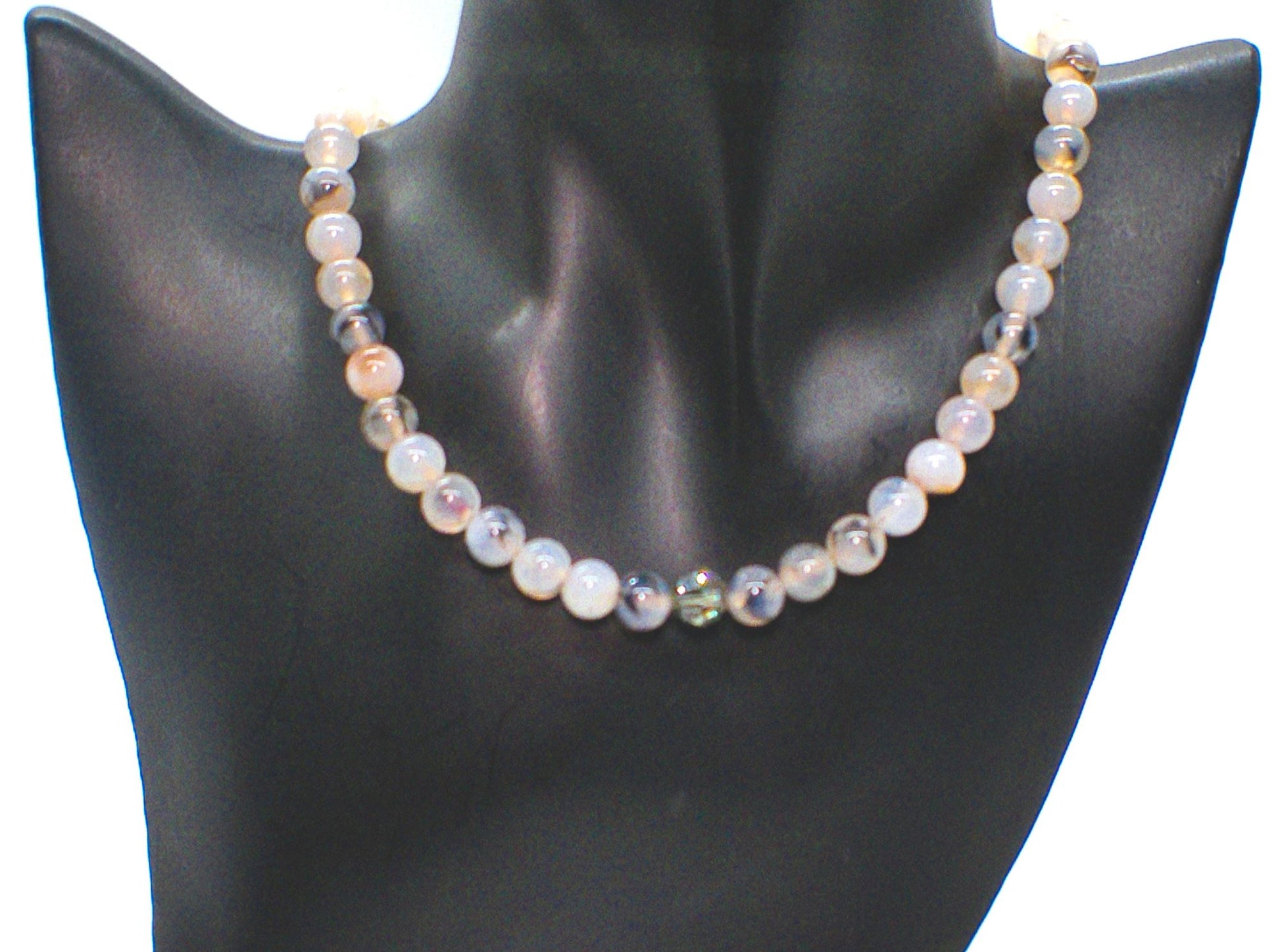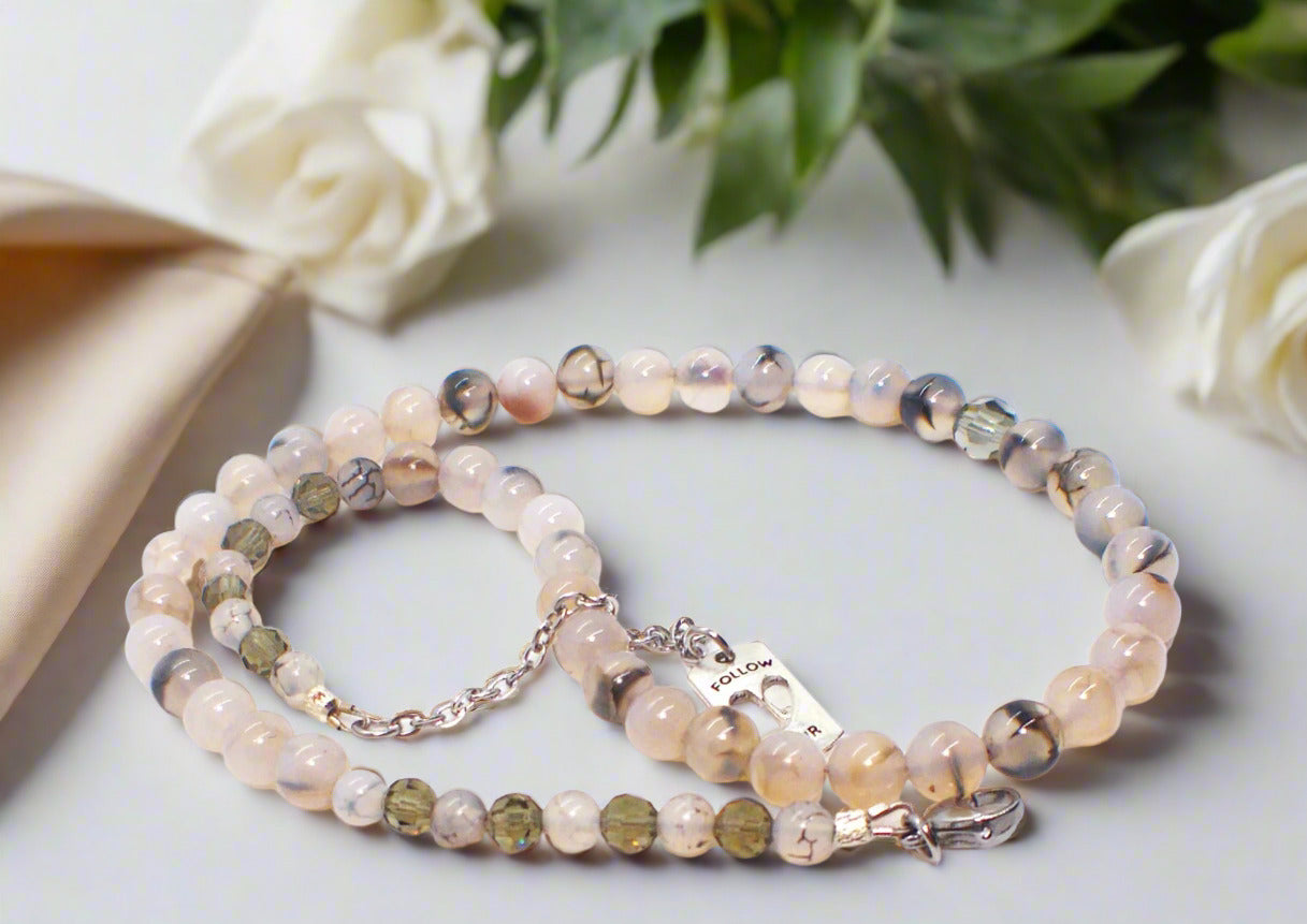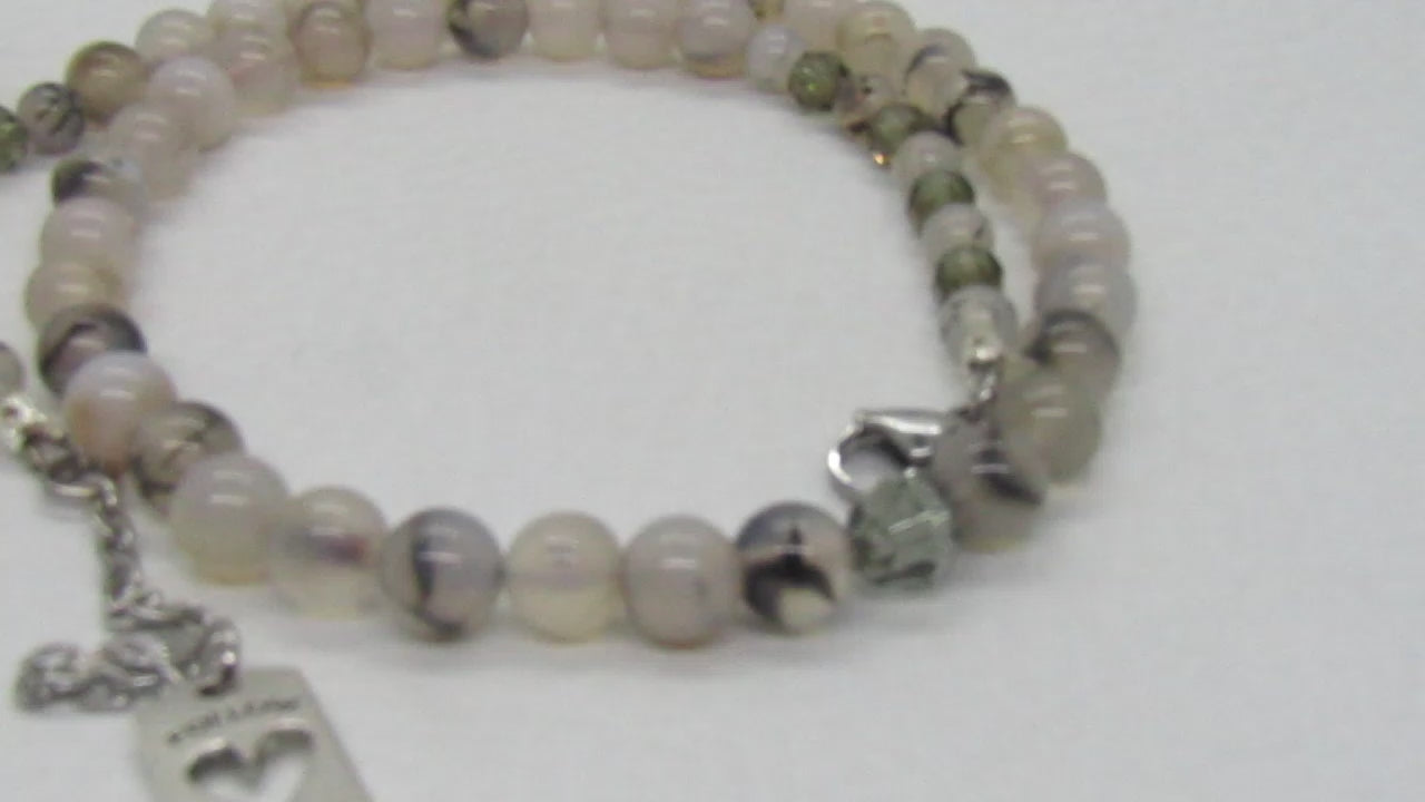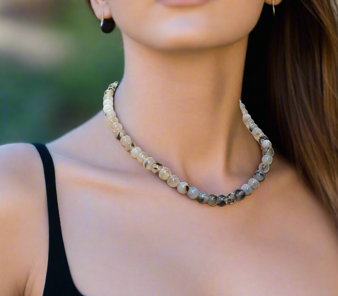 Captivating Black Dragon Vein Agate Necklace - This beautiful one-of-a-kind piece of jewelry is so perfect for those looking for originality. This piece was crafted with beautiful Dragon Vein Agate beads and Swarovski Black Diamond Crystal beads, which added the beautiful finishing touches. Fits beautifully around the neck to be worn with many items in your wardrobe. The perfect gift for that special person or yourself. Simply perfect. Remember it's a one-of-a-kind item. No one else will be wearing the same thing when you go out. It's all about you. Comes in a gift box. Necklace is approx. 19". Has a 2" extender chain with a charming "Follow Your Heart" charm. Colors: cream, black, brown, silver