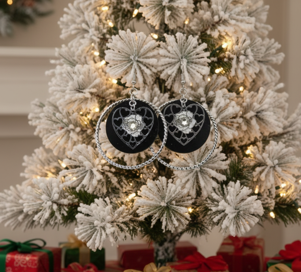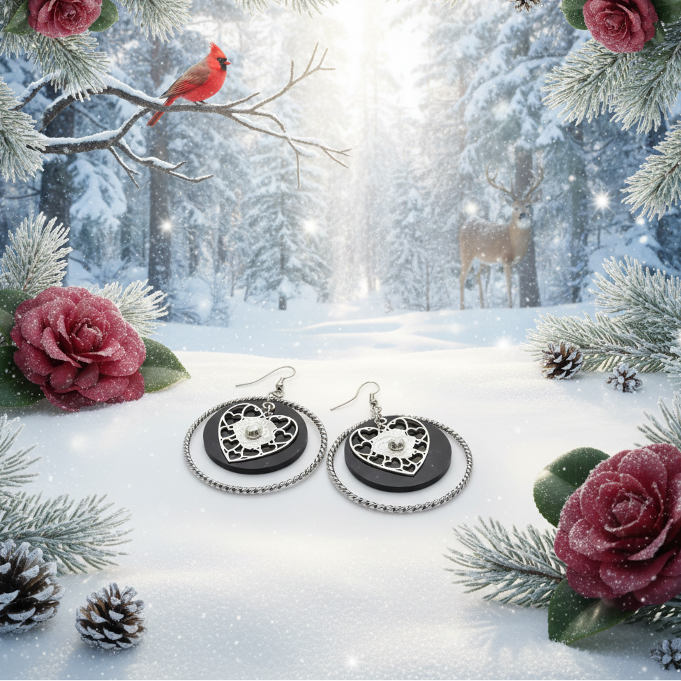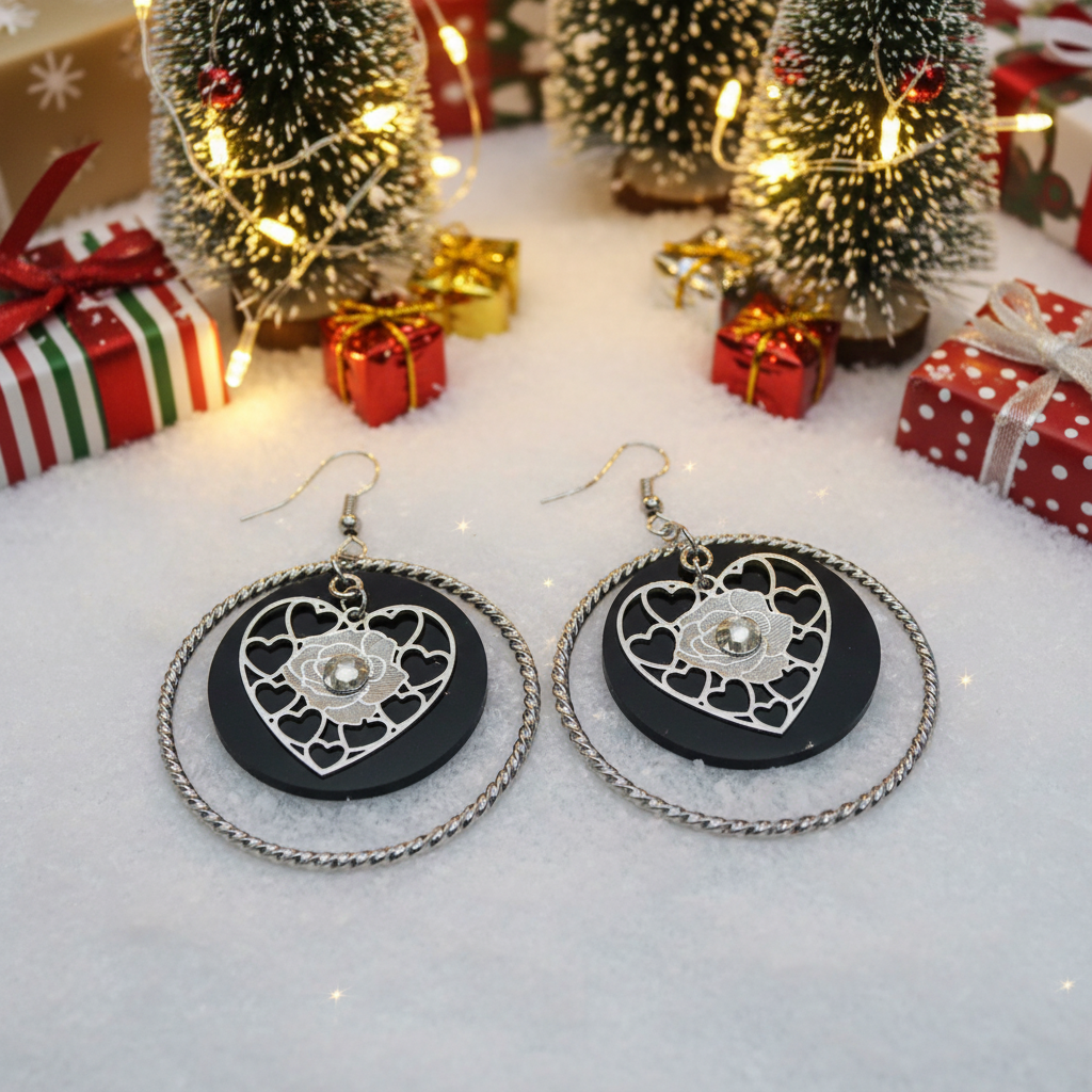 These are charming heart earrings that dangle with grace. These great, large earrings not only have a heart but will have a rhinestone in the center to make them perfect. It makes the perfect gift for all those special people in your life. It also makes a perfect gift for yourself. Go ahead, you deserve it!! Does not come in a gift box. Material: Rhodiumized, black acrylic, lead-compliant, fishhook earrings. Length 2-1/2" x width 1-1/2".