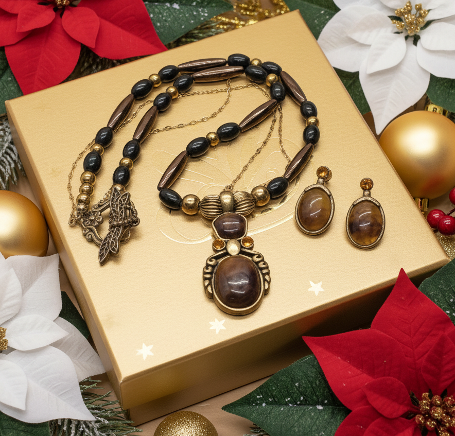 This is the most charming one-of-a-kind vintage necklace set that you can find. Designed to bring romance into your life. Crafted with gold-plated Hematite beads, copper glass beads, and corrugated gold round beads. The matching earrings say it all. It makes the perfect gift for all those special people in your life. It also makes a perfect gift for yourself. Go ahead, you deserve it!! Remember it's a one-of-a-kind item. No one else will be wearing the same thing when you go out. It's all about you. Comes in a gift box. The length of the necklace is approx. 22". Gold chain is approx. 17" in length. Colors: antique gold, browns, and orange.
