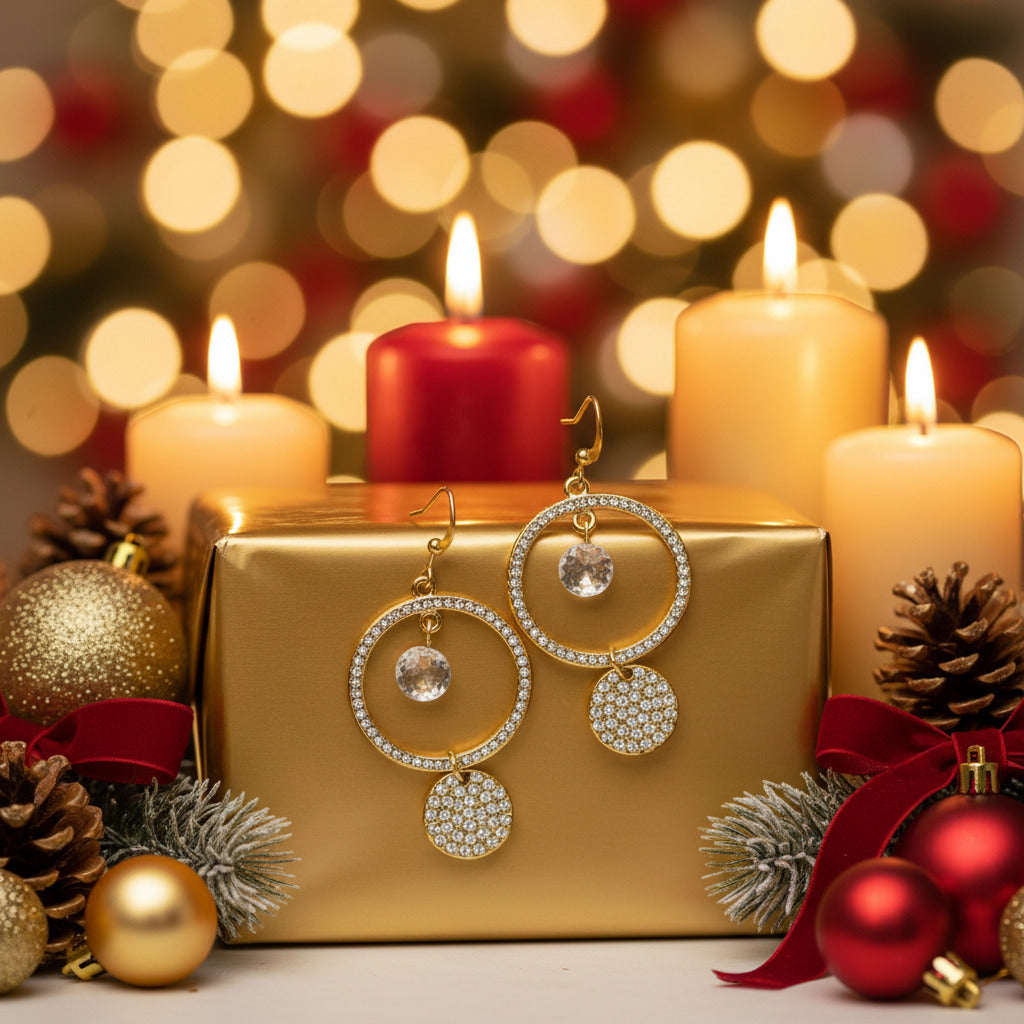 These stunning rhinestone dangle earrings feature circles of rhinestones with a sparkling Cubic Zirconia at the center. They are the perfect accessory to enhance the beauty of anyone who wears them. These earrings also make an exquisite gift for all the special people in your life, or even a lovely treat for yourself—because you deserve it! Each pair comes elegantly packaged in a gift box. Colors: gold, clear