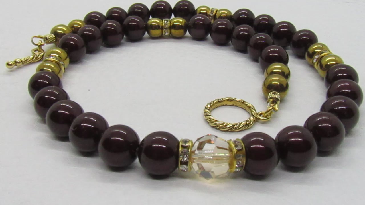 This is a fabulous one-of-a-kind 18" necklace that is pure beauty. It shows gold PAVE rhinestone beads, a large 10mm Swarovski Gold Shadow crystal round bead, Swarovski Pearl Maroon 10 mm round beads, and Hematite GP beads. This necklace is perfect in every way. Get it as a gift for that special person or just for yourself. Remember it's a one-of-a-kind item. No one else will be wearing the same thing when you go out. It's all about you. It comes in a gift box. Approx. 18" length. Colors: maroon, gold, clear.