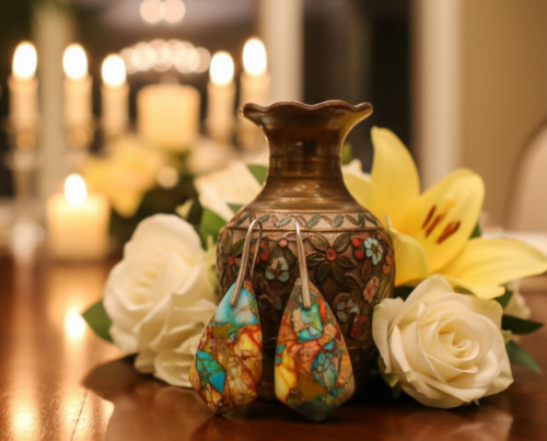Crafted from stunning, colorful Imperial Jasper, each geometric teardrop boasts a captivating tapestry of natural hues and intricate patterns, making every pair uniquely magnificent. The vibrant shades seamlessly blend, creating a visual feast that is both striking and sophisticated.