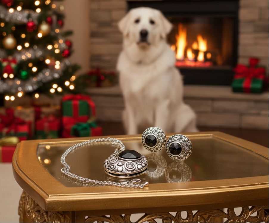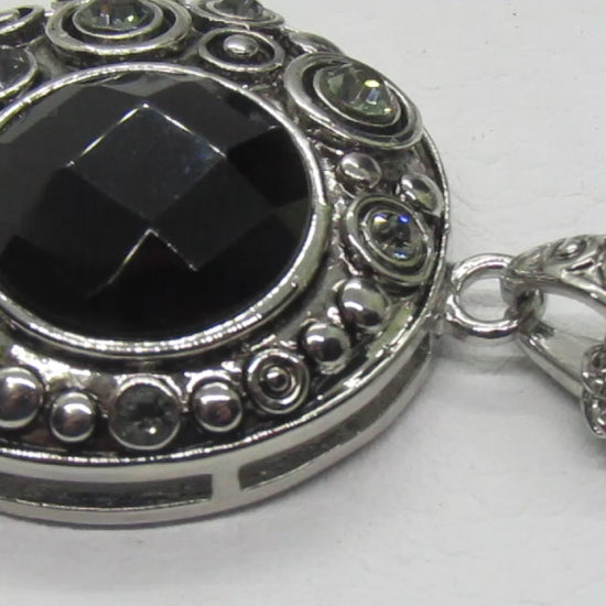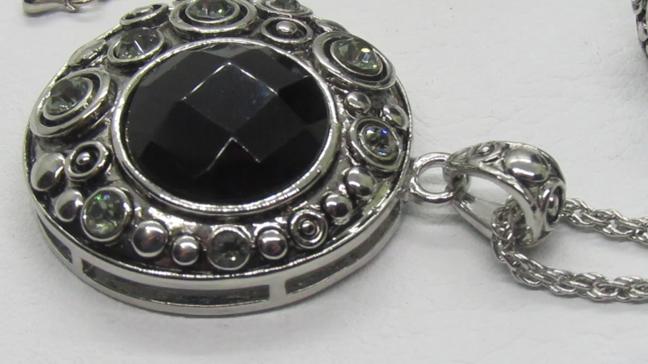 This is a very elegant silver and black necklace set that flaunts small crystals throughout the pendant and earrings. Exceptional design and look. It makes the perfect gift for all those special people in your lives. It also makes a perfect gift for yourself. Go ahead, you deserve it!! Comes in a gift box. Material/Size: Silver Tone / Black Acrylic / Lead&nickel Compliant / Metal / earrings, LENGTH : 20 1/4" + EXT• PENDANT : 1 1/4" X 2"• EARRING : 3/4" X 3/4"• SILVER/BLACK .