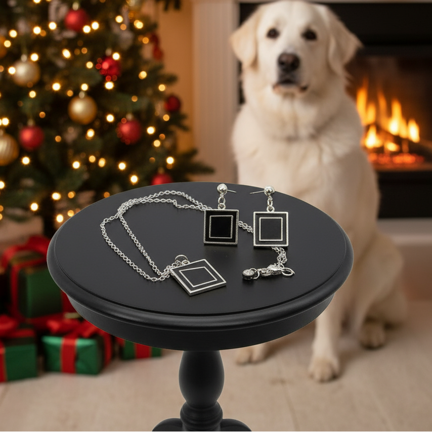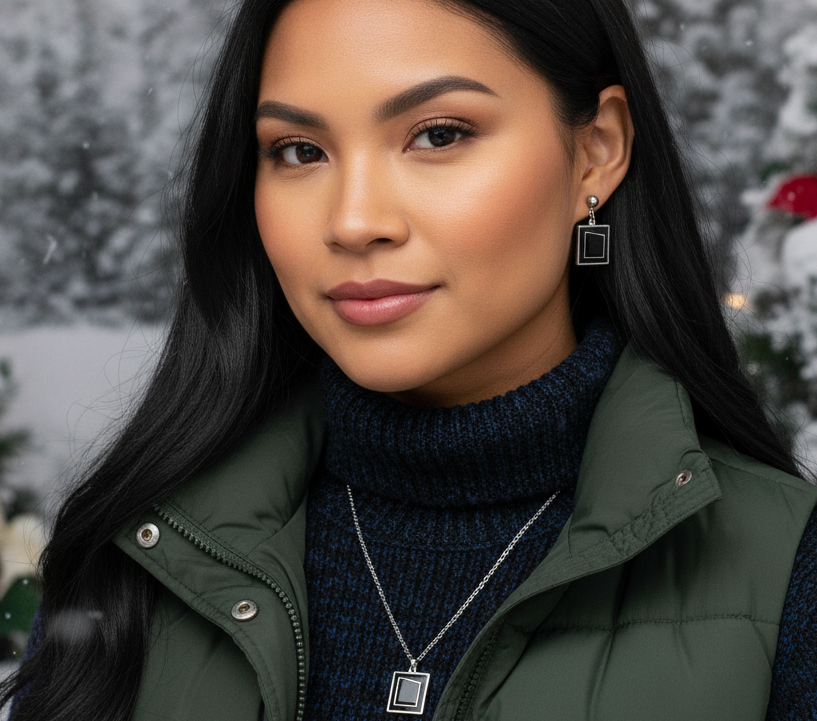This beautiful, exciting Geo necklace will go with you everywhere. It has a lovely black and silver Geo necklace with a beautiful silver stainless steel flat cable chain. In addition, you get a pair of matching earrings to complete the set. Plus a beautiful 6mm black and silver rondelle at the end of the extender chain. This is the perfect gift for that special person or just a way to make you feel fabulous! Comes in a gift box. Size:18 inches in length. Extender:4 inches.
