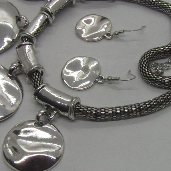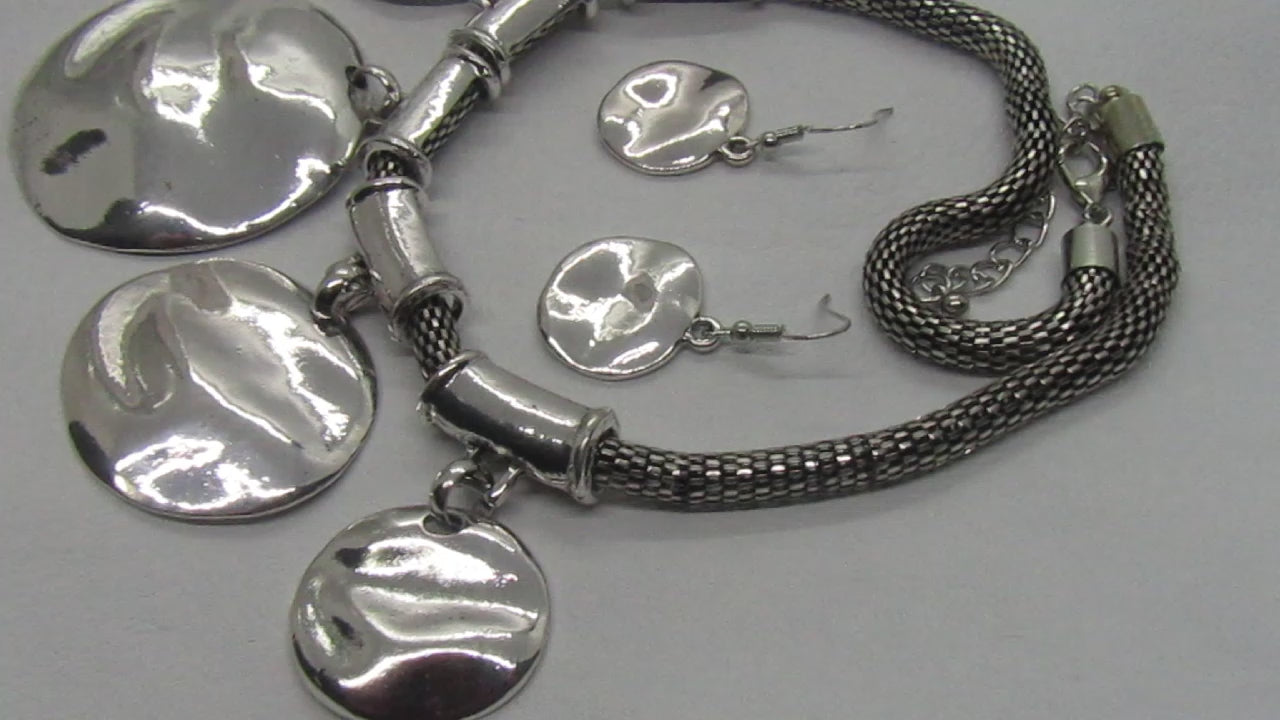 This fabulous silver necklace set has graduated silver drops that caress your neckline. Also, it comes with lovely silver matching earrings to finish off your statement. It makes the perfect gift for all those special people in your life. It also makes a perfect gift for yourself. Go ahead, you deserve it!! Comes in a gift box. Material: Antique Silver Tone / Lead&nickel Compliant , LENGTH : 17 1/4" + EXT• PENDANT : 2 1/8" X 2 5/8"• EARRING : 7/8" X 1 5/8"• SILVER
