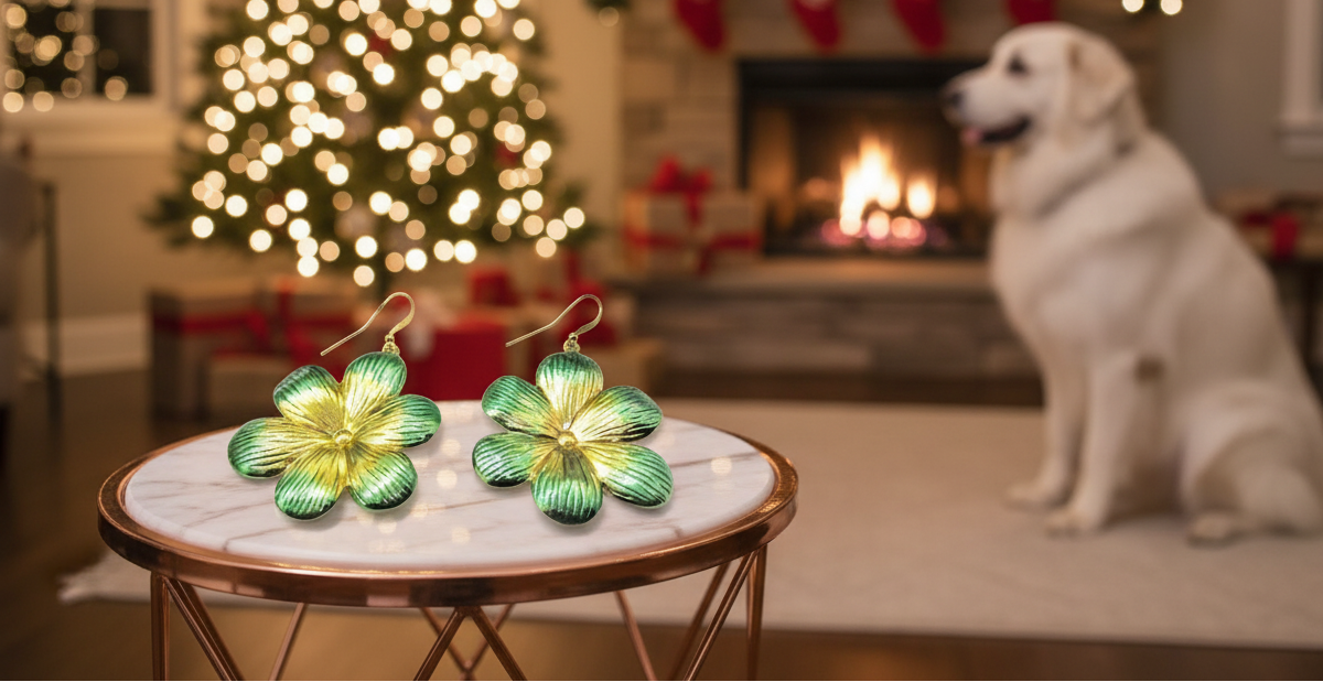 These earrings set the mood of romance. Each earring is a gorgeous flower that dances at the end of the earring hook. The colors in these earrings are green and yellow, and they will make you feel special when you wear them. Lead compliant, width 1-5/8" x 2-1/2". Images on a black display may be larger than their actual size.