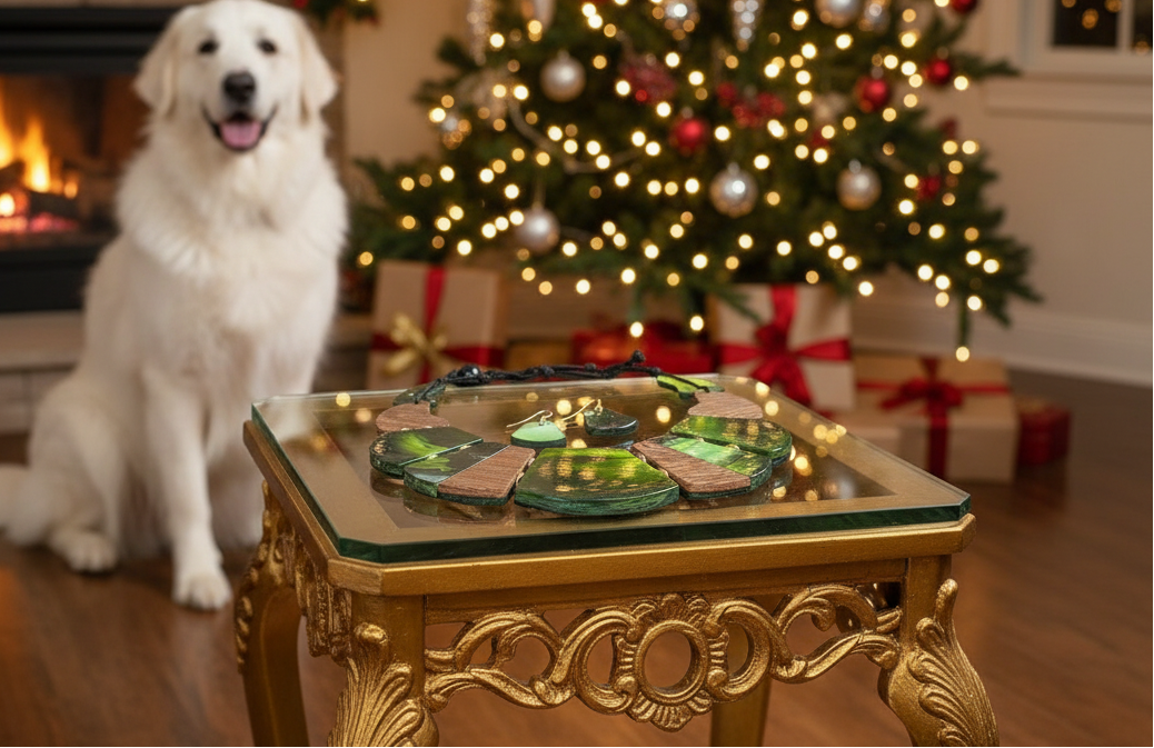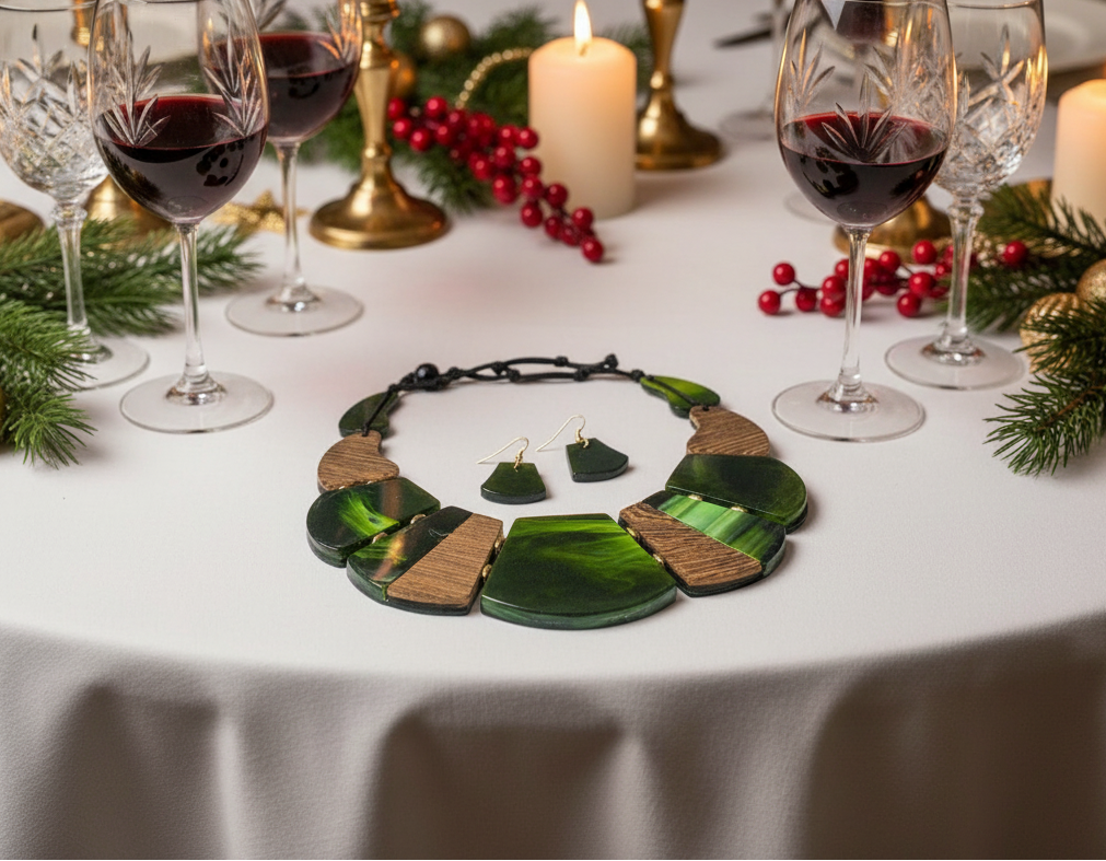 This is a fantastic green and gold graduated necklace set that has accents of wood throughout the drops. Beautiful pattern and can be worn anywhere or anyplace to add a statement to your wardrobe. It makes the perfect gift for all those special people in your life. It also makes a perfect gift for yourself. Go ahead, you deserve it!! Does not come in a gift box. Material: Cellulose Acetate / Lead&nickel Compliant / Metal / Wood / Gold Tone / Black / Brown / Green, LENGTH : 18", EARRING : 7/8" X 1 5/8"• DROP : 2".
