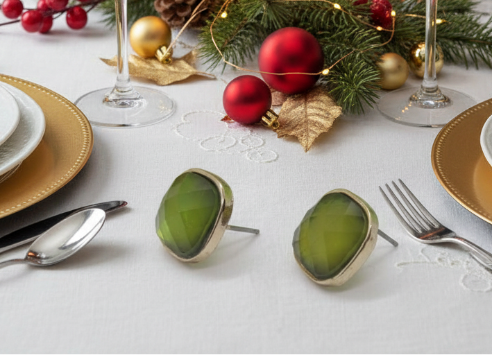 These gorgeous olive green stud earrings are simply precious. Small yet romantic just for that right time of day. They make the perfect gift for all those special people in your lives. They also make a perfect gift for yourself. Go ahead, you deserve it!! Color : Gold, Olive Green • Size : 0.5" W• Post Back • Square Stone Stud Earrings. Does not come in a box.