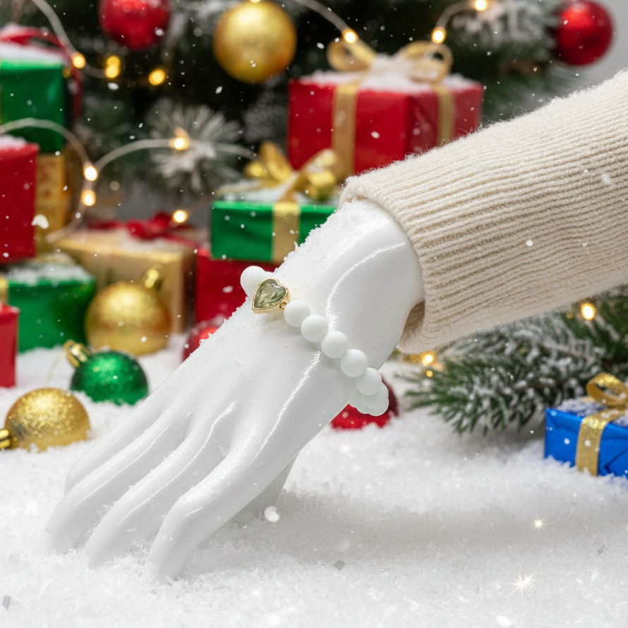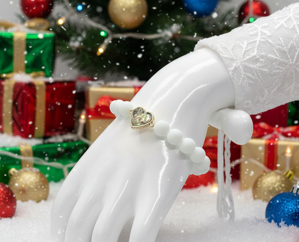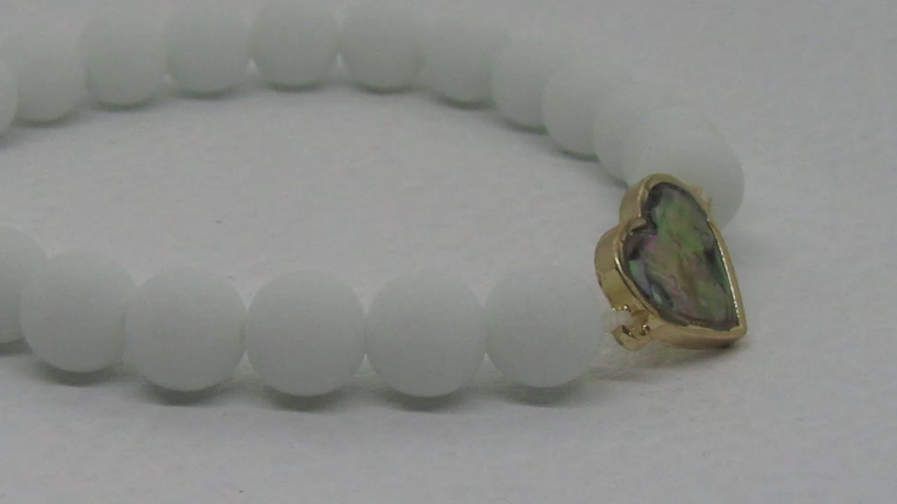 Give your sweetheart this wonderful gift of an abalone heart bracelet. Simple yet sends a special message to your heart. It makes the perfect gift for all those special people in your life. It also makes a perfect gift for yourself. Go ahead, you deserve it!! Comes in a gift box. Color: white, abalone, gold. Size 0.5" H. Bead size: 8 mm. Stretchable. Lead compliant.