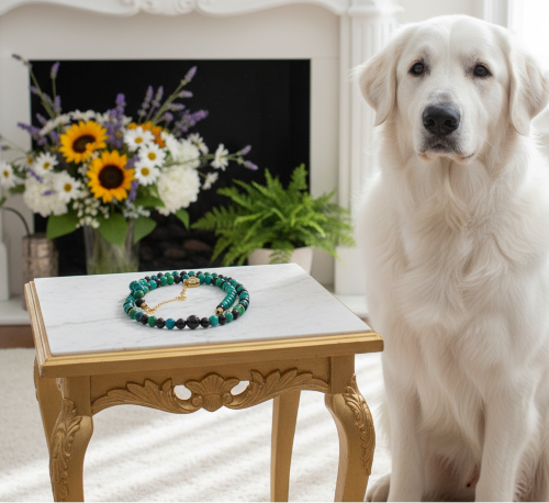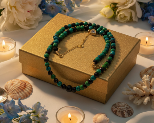 The foundation of this stunning design features rich, polished Black Onyx beads (8 & 6mm), their deep, mysterious allure providing an elegant contrast. These are beautifully complemented by the vibrant, swirling patterns of Chrysocolla beads (6mm). Together, these natural gemstones create a harmonious blend of sophistication and organic beauty.