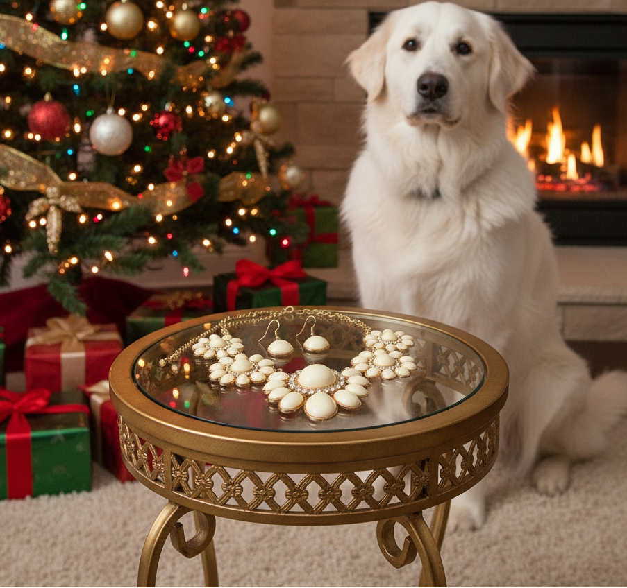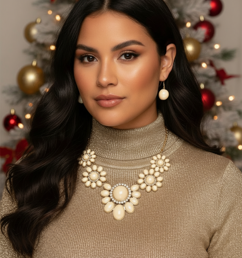 Elevate your style with this exquisite necklace set, featuring delicate ivory flowers adorned with sparkling rhinestones that beautifully surround your neck. It's an essential complement to any outfit, ensuring you shine on that special day. Whether you're dressing up for a wedding or enjoying a casual lunch, this piece guarantees to turn heads and ignite conversations. Indulge yourself or surprise a loved one with this eye-catching gift that truly makes a statement. Available colors: Gold, clear, and ivory, with an adjustable length of approximately 16" - 19". Comes in a gift box.