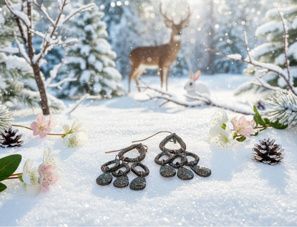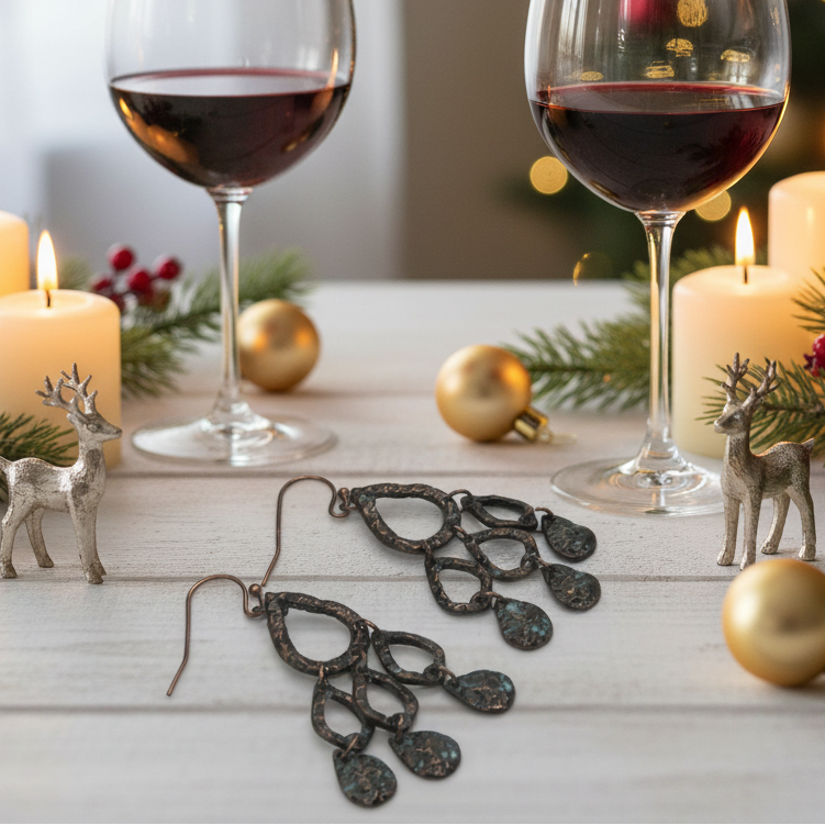 These are some very elegant patina and rose gold chandelier earrings. One large teardrop that leads to two more tiers of lovely small teardrops that graciously dangle off your ear. Simply elegant. It makes the perfect gift for all those special people in your lives. It also makes a perfect gift for yourself. Go ahead, you deserve it!! Comes in a gift box. Material: Lead and nickel compliant, width 5/8" x length 2".
