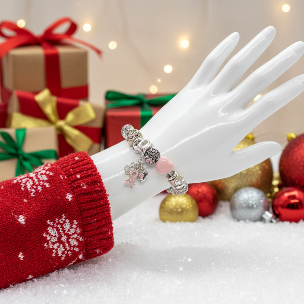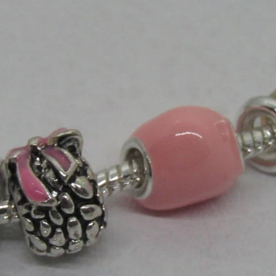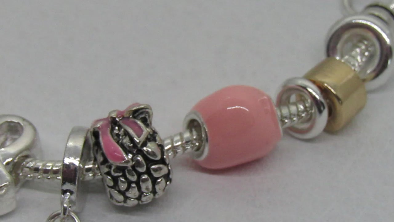 This charm bracelet has beautiful charms of pink with pink ribbon and pink hearts. What an outstanding statement to make with such beauty. Give it as a gift or purchase it for yourself. Either way, it will always make a statement. Comes in a gift box. Color: Gold, pink, silver. Size 1/25" H, 7.5" +1" L. Lobster claw closure. Nickel and lead compliant.