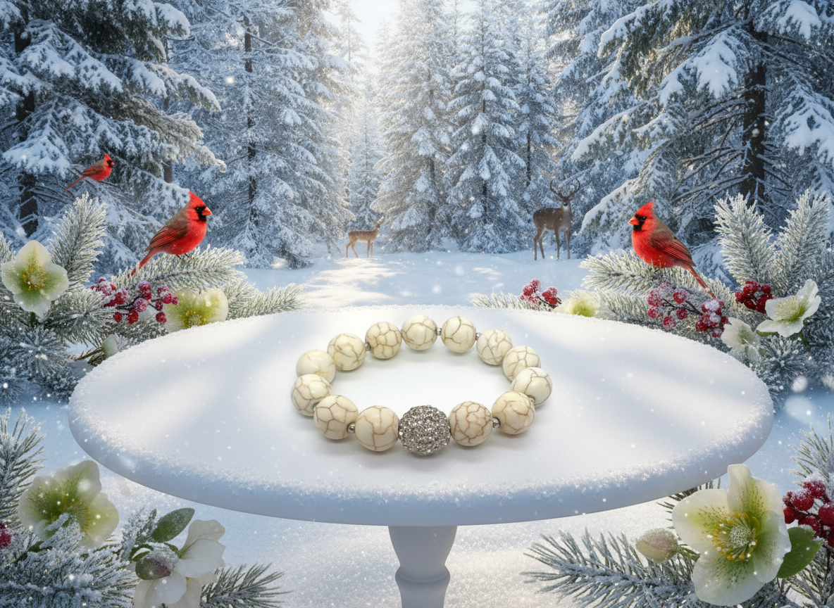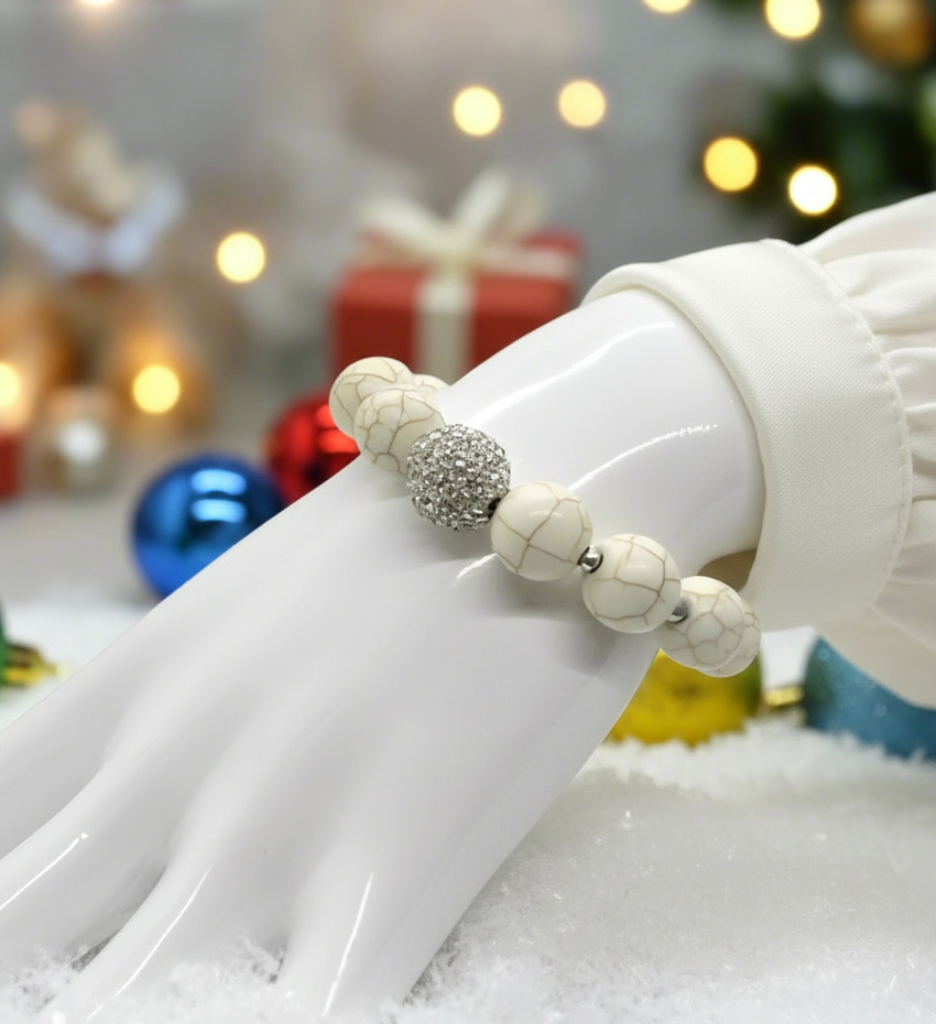 This is a beautiful semi-precious stone bracelet with elegant rhinestones. This bracelet can fit almost any wrist and can be worn with almost any outfit. It makes the perfect gift for all those special people in your life. It also makes a perfect gift for yourself. Go ahead, you deserve it!! Comes in a gift box. Material: Silver Tone / Ivory Semi Precious Stone & Clear Casting-Rhinestone / Stretch / Bracelet, SIZE FREE : STRETCH. • WIDTH : 1/2" .