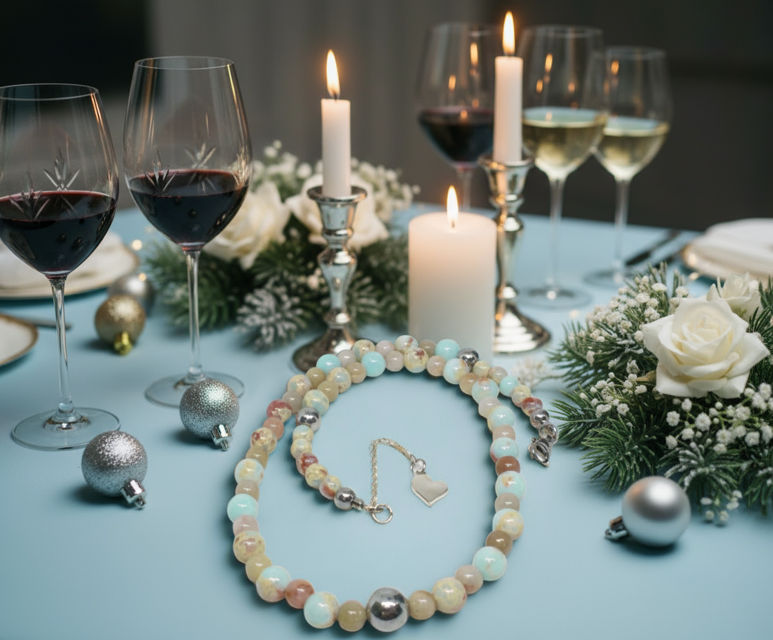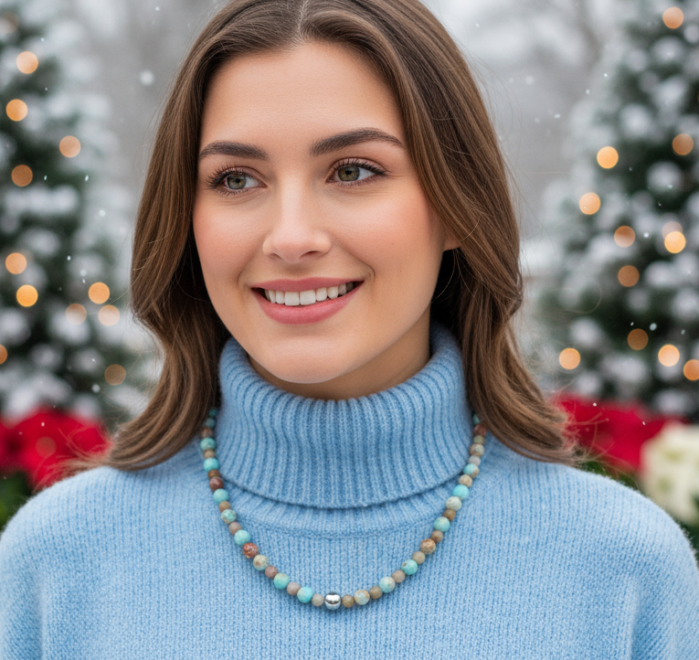This amazing one-of-a-kind, one-strand necklace is designed with gorgeous Sky Blue Jasper beads, Fancy Quartz, and amazing SP Hematite beads. Again, it is a versatile necklace that can be worn with almost anything. Simply perfect. No one else will be wearing the same thing when you go out. It's all about you. Comes in a gift box. The length of the necklace is approx. 19-inches in length. Remember it's a one-of-a-kind item.