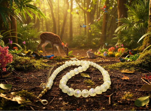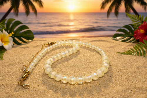 This exquisite necklace radiates with the ethereal glow of beautiful Celestial Opal crystal beads, whose iridescent, multi-faceted colors dance with every movement, creating a truly enchanting display. These luminous crystals are perfectly complemented by the luxurious shimmer of gold-plated (GP) Hematite, adding a sophisticated metallic contrast and beautiful finishing touches. Together, these elements form a harmonious blend of refined charm and radiant allure.