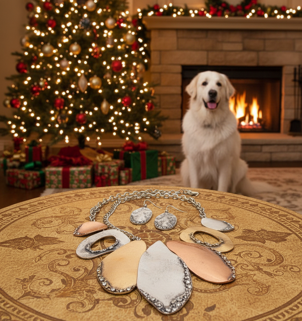 This intriguing necklace, featuring geometric shapes of different colored metals, is laced with rhinestones. It is so beautiful and can be worn with anything in your wardrobe at any time of the day. It also makes the perfect gift for all those special people in your life. It also makes an ideal gift for yourself. Go ahead, you deserve it!! Set includes antique silver earring drops. Comes in a gift box. Colors: antique gold, antique silver, and copper. Approx. 18" - 21" long in length.
