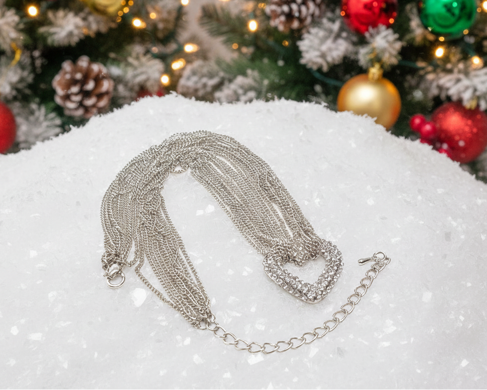 NECKLACE / METAL HEART / MULTI CHAIN / PAVE CRYSTAL STONE / LINK / 16 INCH LONG / 1 INCH.