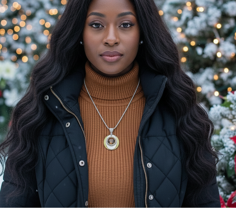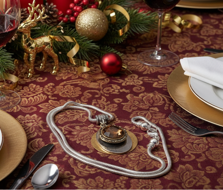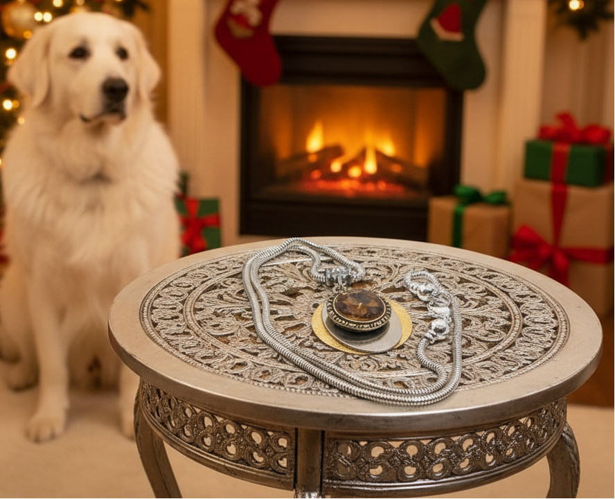 This is the piece of jewelry that everyone wants for those special events. What a wonderful gift to that special person in your life, or a piece of jewelry that can make you feel wonderful. Crafted with a silver-plated snake chain, a stainless steel flat oval tag, a gold wafer tag round, and a gorgeous pendant made with beautiful chanton glass Rivoli with antique trim. Make a statement with this magnificent piece of jewelry. Remember, it's a one-of-a-kind item. No one else will be wearing the same thing when you go out. It's all about you. Comes in a gift box. The necklace is 18" in length.