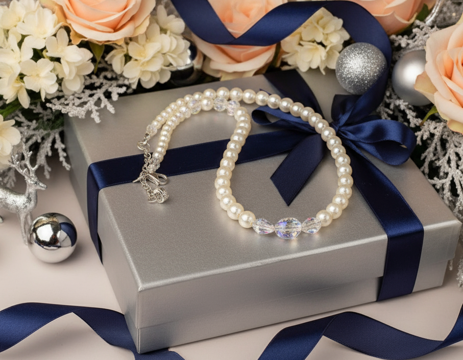 Precious Light Peach, Silver, Crystal and Pearl Beaded Necklace handcrafted by Artistry Jewelry