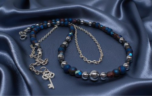 This radiant necklace features a mesmerizing blend of earthy and vibrant tones. Genuine natural blue Lava (d) beads offer an intriguing texture and a grounding presence, beautifully complemented by the sleek, metallic gleam of silver-plated (SP) Hematite. Interspersed throughout are captivating blue/black oval glass beads and Firepolish AB matte beads, creating a dynamic interplay of blue, brown, black, and multi-faceted colors that shimmer with every movement.