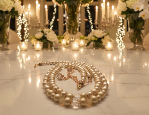 This stunning two-strand piece radiates with the soft, warm hues of a golden hour. It features luminous beige Celestial Crystal Pearl glass beads and shimmering Preciosa Crystal Honey beads, creating a harmonious blend that evokes sun-drenched landscapes and sweet elegance. To highlight the longer strand and add an unparalleled focal point, two gorgeous Swarovski Sand Opal round beads are expertly placed, their stunning radiance perfectly tying the design together.