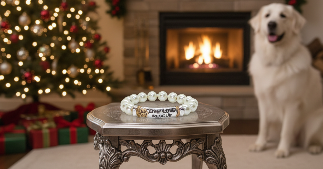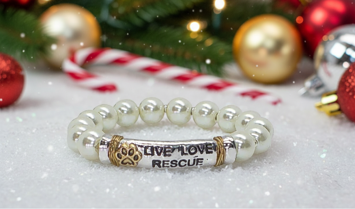This is a beautiful inspirational bracelet to encourage to "Live Love Rescue" our wonderful pet family. It is a multi-pearl stretch bracelet that will fit almost any wrist, and the perfect gift for all your pet lover friends and family. Maybe a special gift just for you. Comes in a gift box. Colors: white, gold, silver, black.