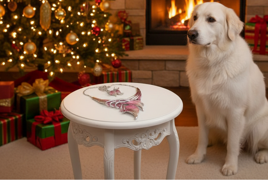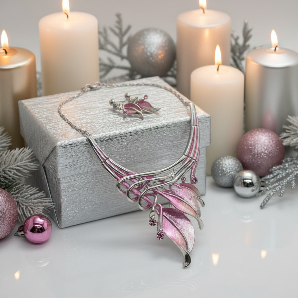 This is a fabulous necklace set that shows off graceful leaves embraced by sparkling rhinestones. This set can be worn with any type of wardrobe to add dazzle to your day. The black display may make items appear larger or shorter than their actual size. Color: Pink, silver. approx. 18" - 21" long in length. Comes in a gift box.