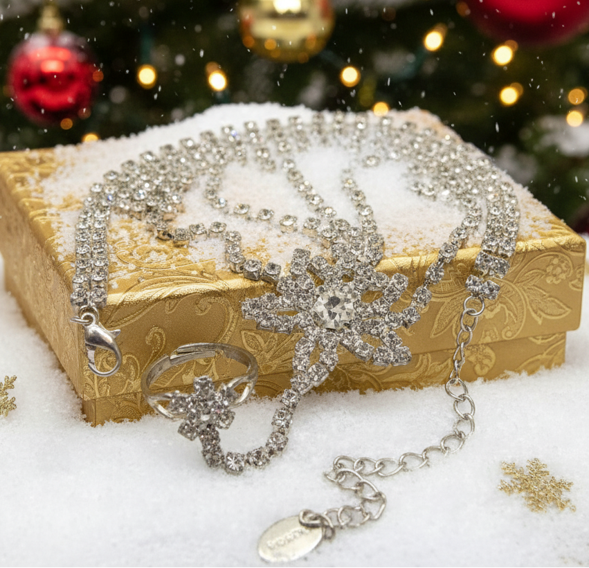 Grab this fantastic wrist and ring bracelet made of rhinestones with a center focal point of a rhinestone flower. They are simply breathtaking and perfect for any occasion, especially for weddings, proms, or other events. Treat yourself or surprise a loved one with this exquisite gift. Go ahead, you deserve it!! Comes in a gift box. Color: clear.