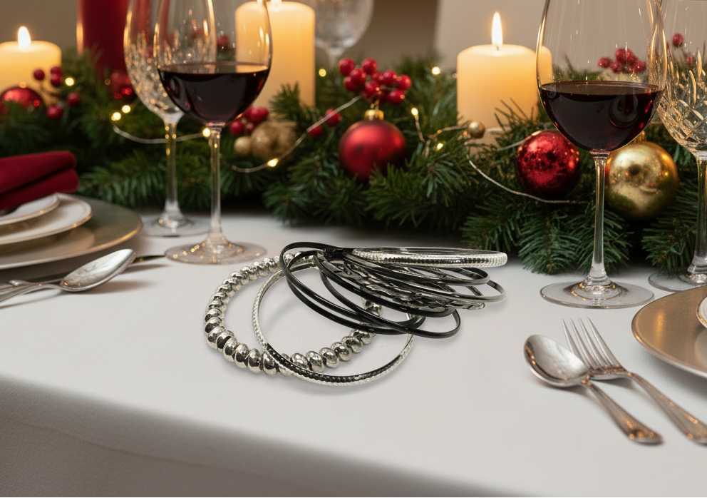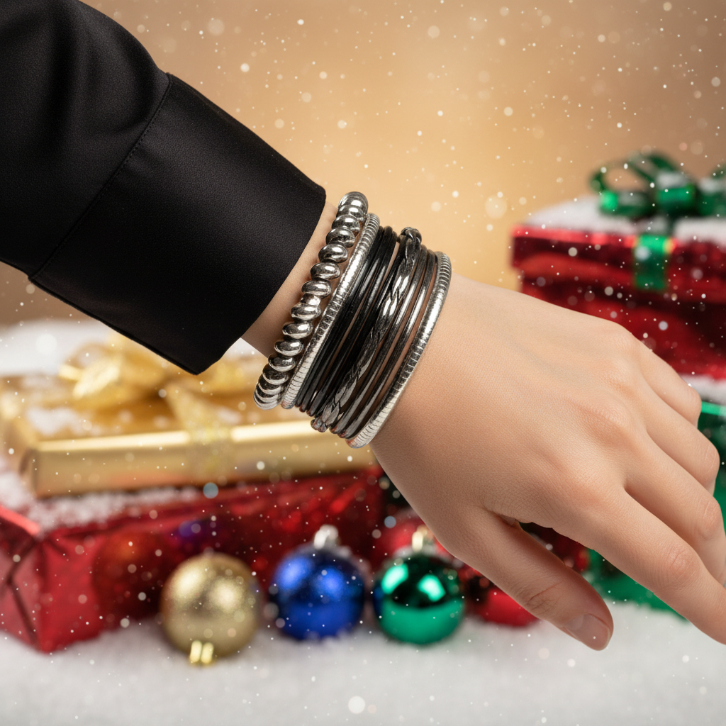Grab this fabulous 11-strand bangle bracelet before it goes. Wear it in many different ways or wear it all together, looks fantastic no matter how you wear it. It makes the perfect gift for all those special people in your life. It also makes a special gift for yourself. Go ahead, you deserve it!! Fits smaller wrists. Comes in a gift box. Colors: silver, black.