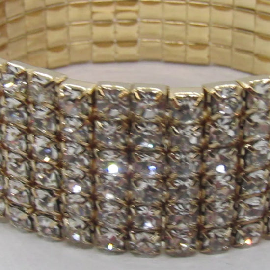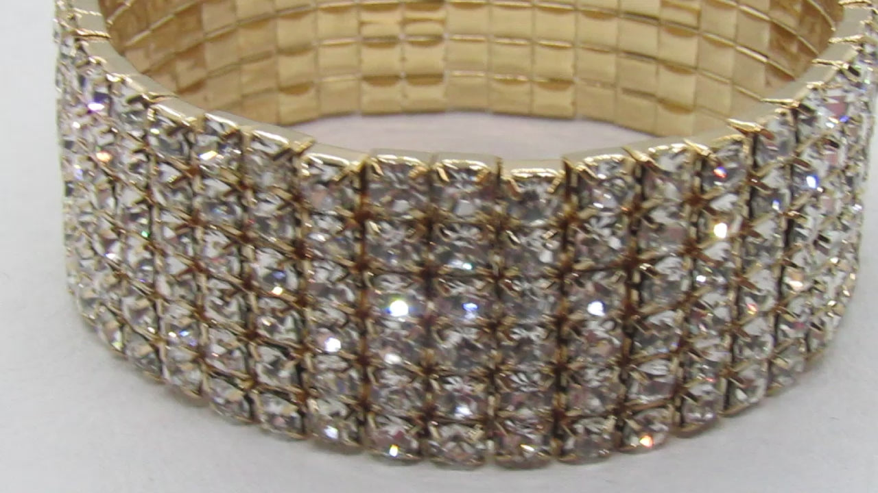 This is a stunning gold and rhinestone bracelet that looks fabulous on any wrist. Wear it where ever you want or give as a fantastic gift to that special person. Comes in a gift box. Material: Gold Tone / Clear Rhinestone / Stretch Bracelet,SIZE FREE : STRETCH• WIDTH : 3/4"