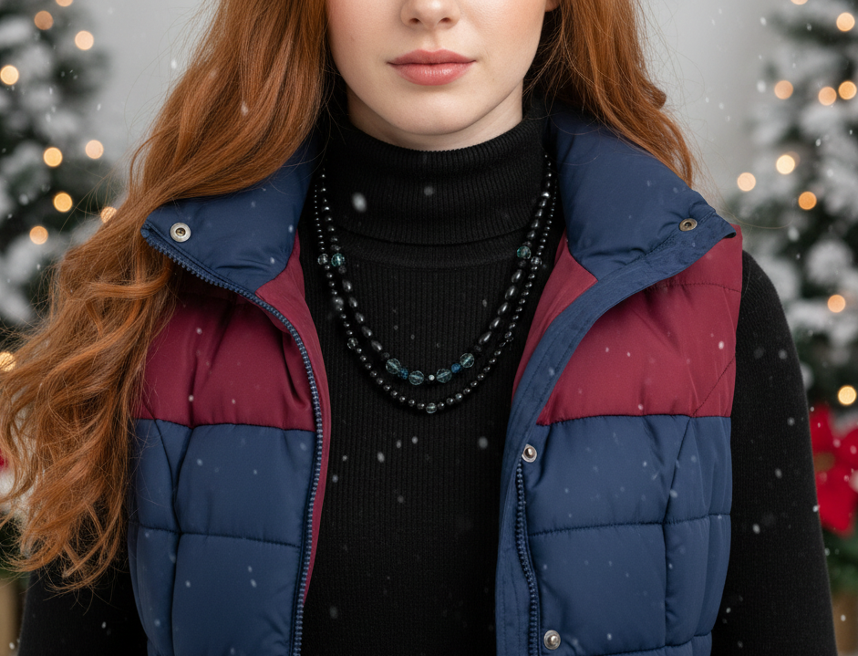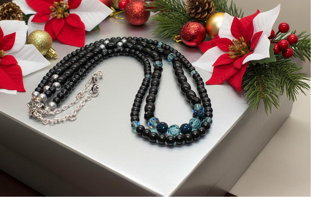 This is a fabulous one-of-a-kind handmade two-separate-strand necklace that was designed with love just for you. This necklace is made with Swarovski Indian Sapphire AB crystal beads, Czech crystal PAVE balls, and black and gray pearl glass beads. This is a statement necklace that will turn everyone's head as you flaunt the beauty it shares with you. Just imagine giving this fantastic necklace to that special person or even giving yourself that much-needed present you have dearly earned. Anyway you choose, it makes this the perfect gift. Remember, it's a one-of-a-kind item. No one else will be wearing the same thing when you go out. It's all about you. Comes in a gift box. Color: Black, gray, blues, Size: small 20-1/2", large approx. 22".