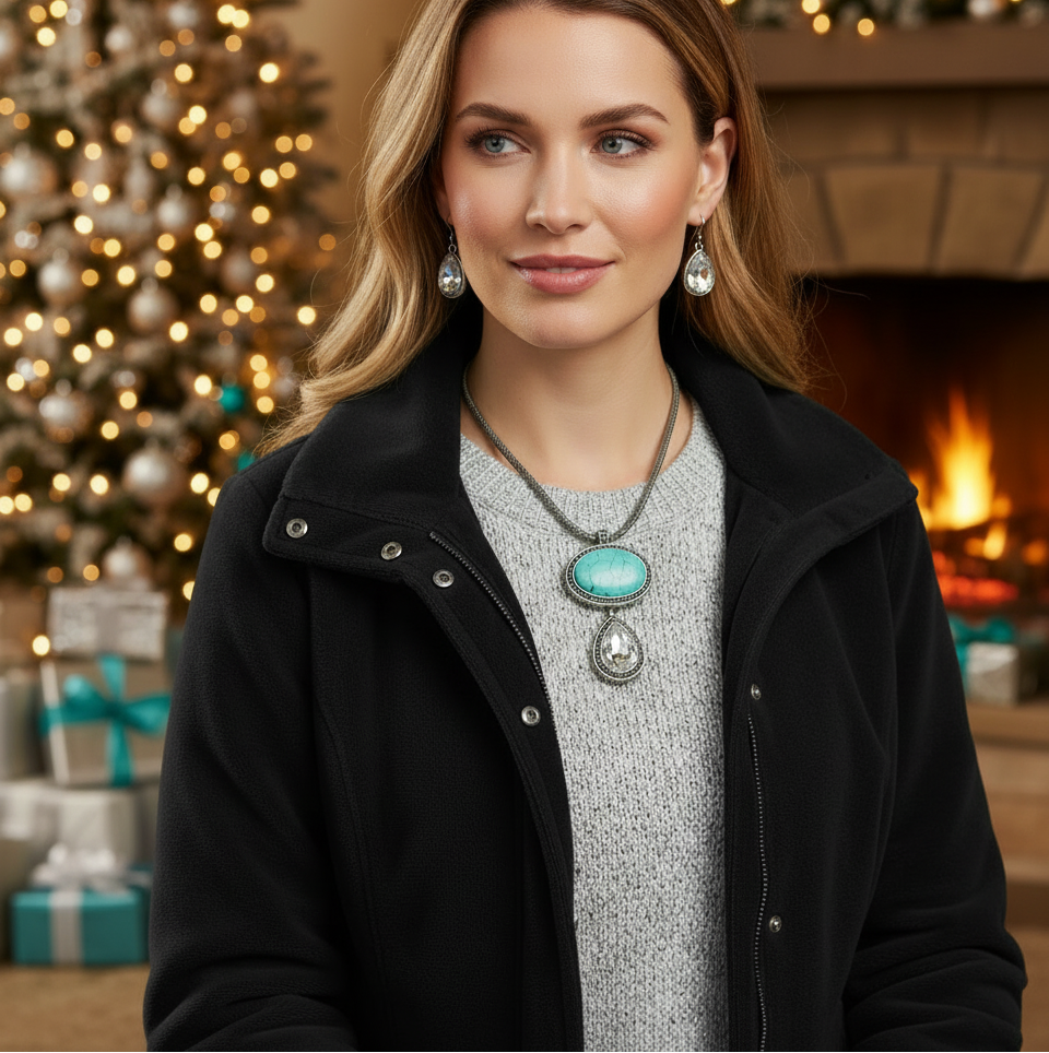 This beautiful necklace set boasts a large pendant of imitation turquoise and a teardrop pendant of rhinestone. It's a must-have addition to any outfit, ensuring you shine on special occasions. Whether you're attending a wedding or enjoying a casual lunch, this piece is sure to attract attention and spark conversations. Treat yourself or surprise a loved one with this eye-catching gift that truly makes a statement. You deserve it! The set comes packaged in a gift box for your convenience. Color: antique silver, turquoise, and clear. approx. 18" - 21" long, approx. Pendant 3.7" long.