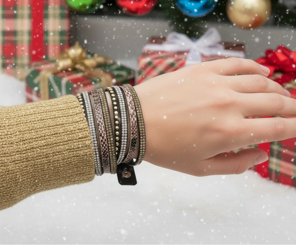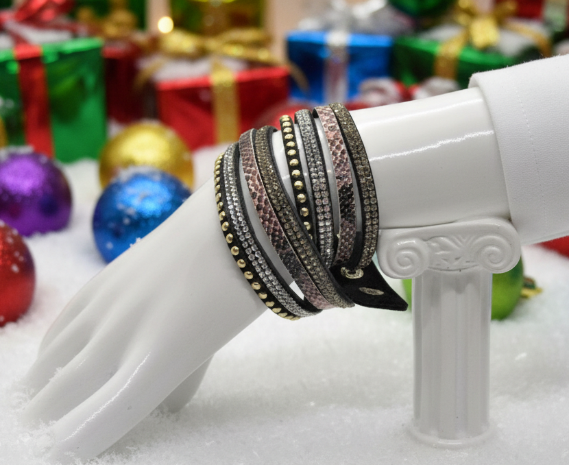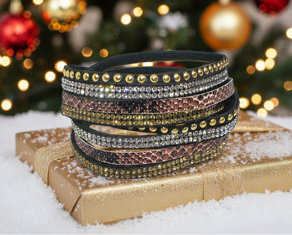This is the perfect multi-strand wraparound bracelet that can be worn wherever you want to wear it. It flaunts strands of snake skin, and animal print looks. Added to that we have a strand of lovely PAVE crystal stones and another strand with metal studs. Perfect look for that unique person. It makes the perfect gift for all those special people in your life. It also makes a perfect gift for yourself. Go ahead, you deserve it!! Comes in a gift box. Material: snap button closure, faux suede bands. Size: 14 inches long and 3/4 inches tall.