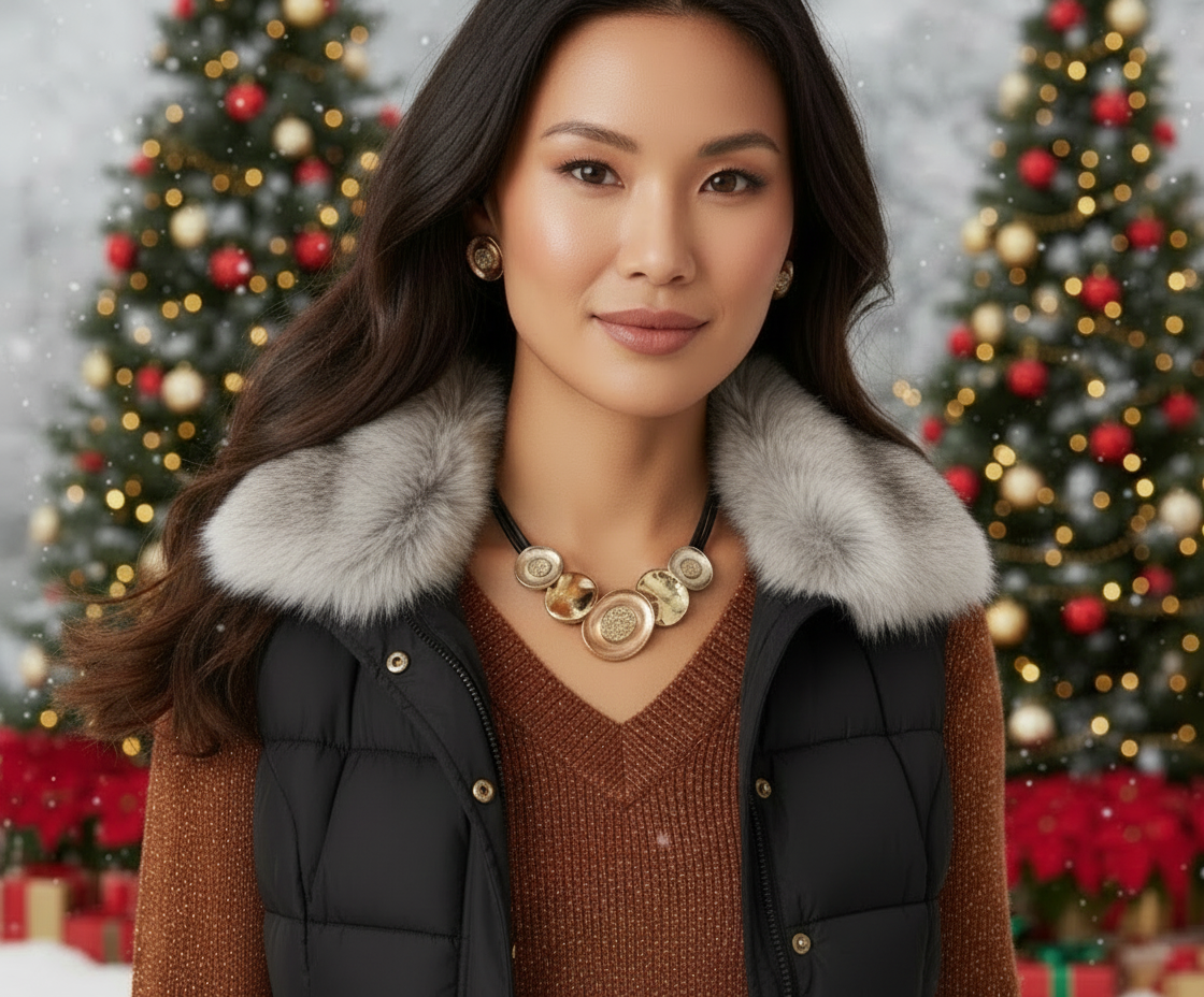 This is a wonderful multi-strand graduated choker set that mixes leather and metal fabulously. The pendant is of graduated metal geometric shapes that have rhinestones glistening from their centers. This set has matching round earrings. Simply beautiful. It makes the perfect gift for all those special people in your life. It also makes a perfect gift for yourself. Go ahead, you deserve it!! Comes in a gift box. Material: Gold-tone, lead, and nickel-compliant, leatherette metal. Button(earrings). LENGTH: 17 1/8" + EXT. • EARRING : 3/4" X 13/16"• DROP : 1 3/16".